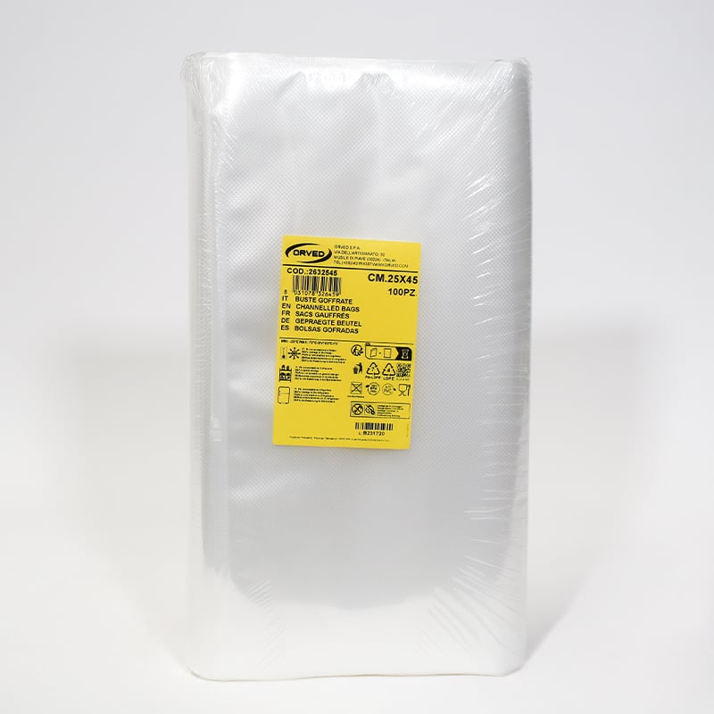 ORVED channel bags, thanks to their special rhomboidal embossing, allow you to extend the life of solid and dry products up to 4/5 times longer than traditional storage.
